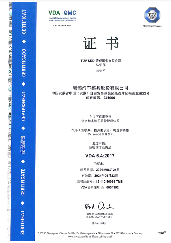 ????????瑞鵠汽車模具股份有限公司成立于2002年3月,坐落于中國(安徽)自由貿(mào)易試驗區(qū)蕪湖片區(qū)銀湖北路 22 號,股本數(shù)18360萬,公司的主營業(yè)務為汽車沖壓模具、檢具及焊裝自動化生產(chǎn)線的開發(fā)、設計、制造和銷售,主要產(chǎn)品有沖壓模具(覆蓋件模具、高強板模具)及檢具、焊裝自動化生產(chǎn)線、一體化鋁壓鑄零部件,為國內(nèi)少數(shù)能夠同時為客戶提供完整的汽車白車身高端制造裝備、智能制造技術及整體解決方案的企業(yè)之一。
